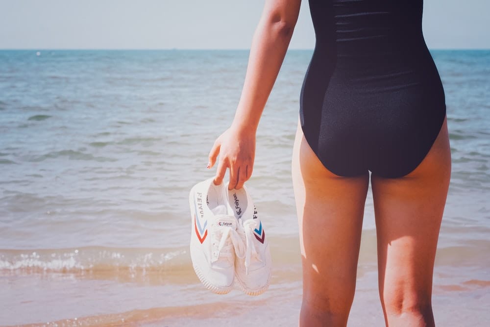 Paint By Numbers | Yantai - Woman Wearing Black Monokini While Holding Pair Of White Lace-Up Shoes On Beach During Daytime